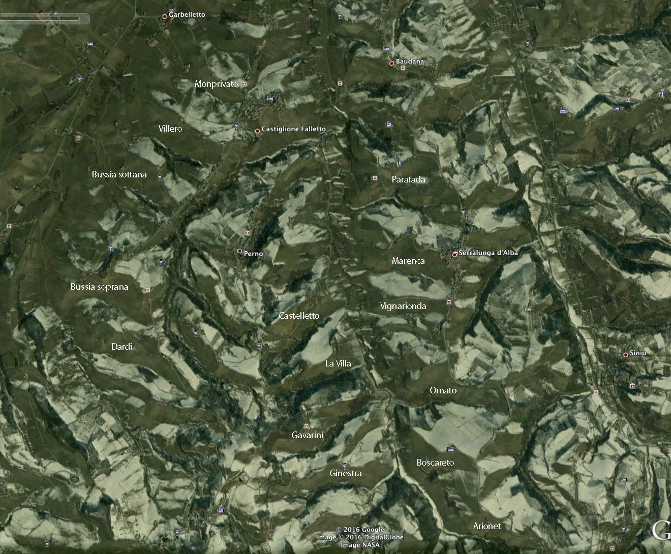 Per avere poi una prova visiva e inequivocabile di come l’esposizione agisca basta cliccare sulle due immagini qui di seguito. Scattate una da terra e l’altra dal satellite (fonte Google), ed entrambe relative alla valle di Serralunga d’Alba, mostrano con chiarezza come le posizioni più calde, sud e sud-ovest, siano anche quelle dove la neve si scioglie per prima. Un effetto che mette oltretutto in particolare risalto una caratteristica tipica delle colline del Barolo, ovvero quella disposizione a spina di pesce dei crinali sulla quale avremo modo di tornare anche più avanti e che si può apprezzare anche nell’ultima immagine panoramica di sfondo.