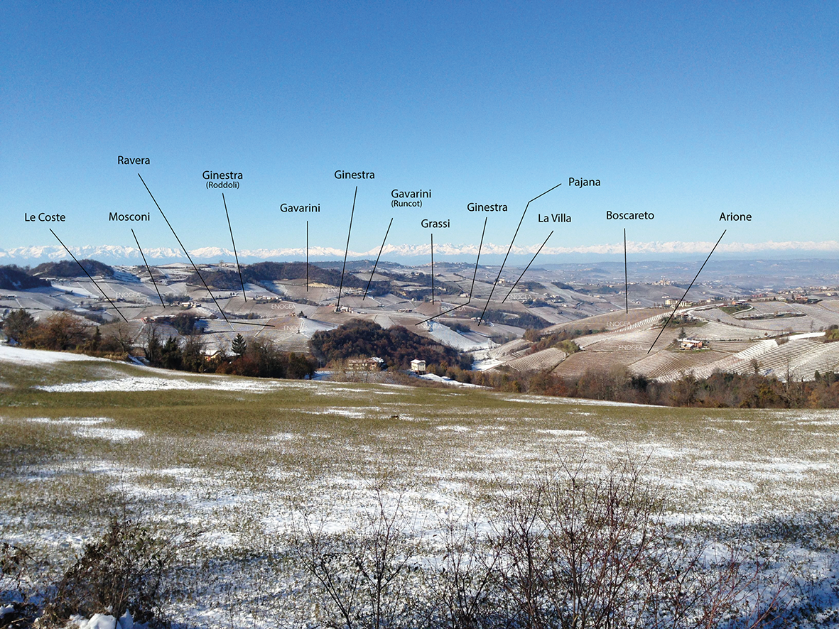 Nella prima immagine di sfondo il nostro punto di osservazione si trova infatti in prossimità del paese di Castiglione Falletto, quindi non lontano dal centro geografico della denominazione. Di sicuro in un punto in cui è possibile osservare con il giusto dettaglio buona parte della denominazione (vedi la seconda immagine) e dei cru più famosi, fatta eccezione per il versante occidentale di La Morra, Novello e Verduno, che si affaccia sul Monviso, la parte meridionale di Monforte d’Alba, che guarda verso l’Alta Langa, e il versante orientale di Serralunga d’Alba.